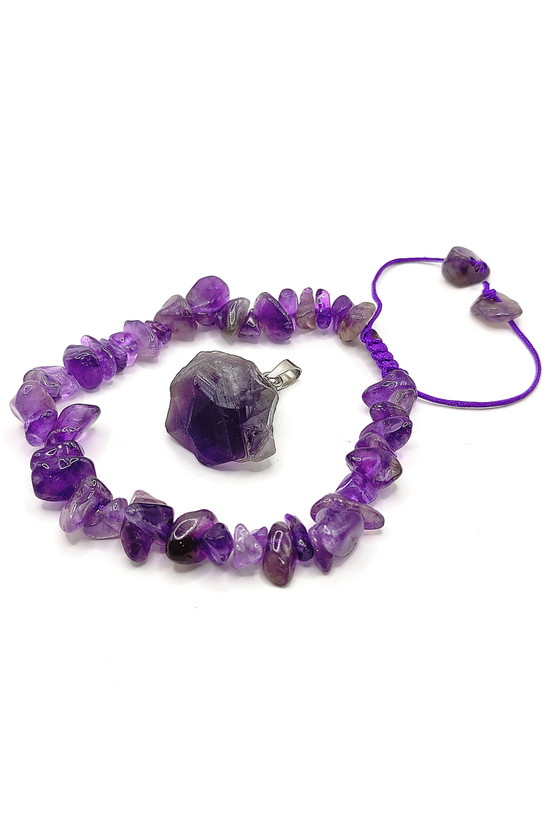 این سِت با سنگهای آمیتیست طبیعی، ترکیبی منحصربهفرد از رنگهای بنفش عمیق را به نمایش میگذارد.